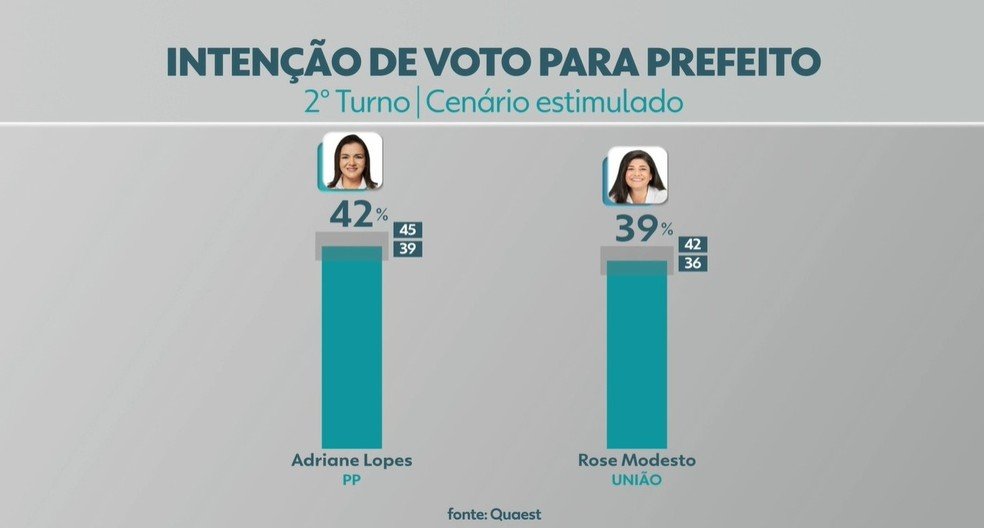 No cenário estimulado, em que os entrevistados são apresentados aos nomes das candidatas, Adriane Lopes lidera com 42% das intenções de voto, enquanto Rose Modesto aparece em segundo lugar, com 39%. Entre os entrevistados, 6% não souberam responder e 13% indicaram que votariam em branco, nulo ou não votariam no 2º turno.