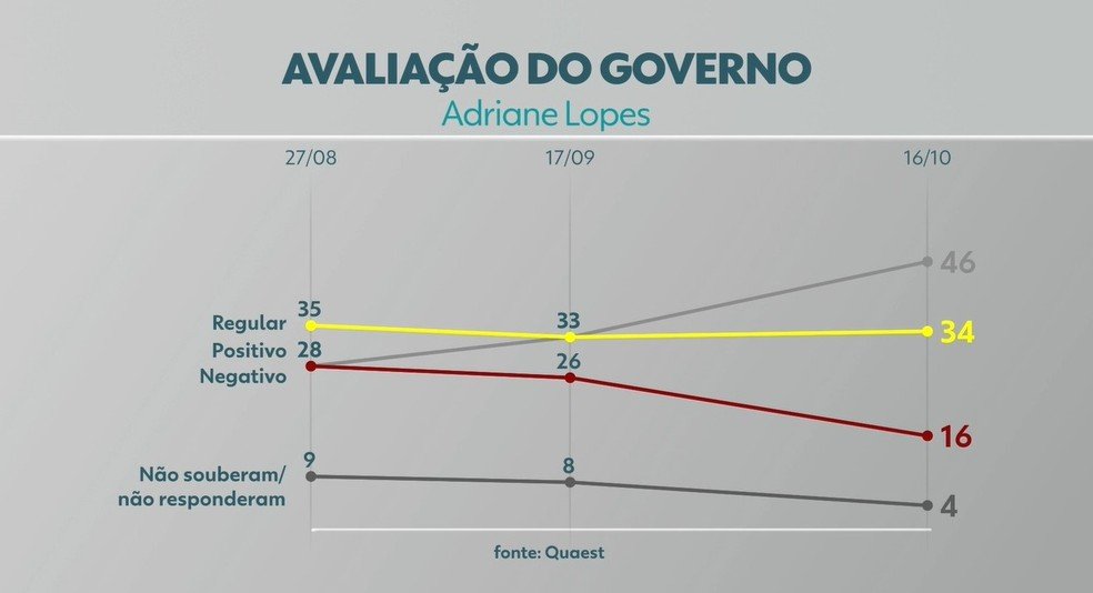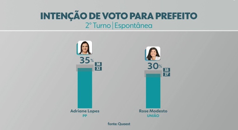Com a margem de erro considerada, que é de 3 pontos para mais ou para menos, Adriane e Rose estão tecnicamente empatadas, tanto no cenário espontâneo quanto no estimulado, evidenciando a disputa acirrada entre as candidatas na reta final da campanha.