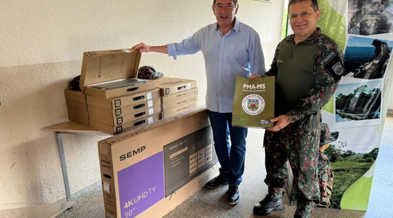 O presidente da ALEMS, deputado estadual Gerson Claro entregou nesta segunda-feira os equipamentos de informática adquiridos via emenda parlamentar para o Projeto Florestinha da Polícia Militar Ambiental (PMA) em Campo Grande.