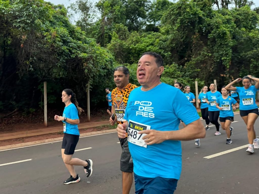 Com caminhada de três quilômetros e corridas com percursos de cinco e dez quilômetros, a 2ª Corrida dos Poderes teve concentração, largada e chegada no estacionamento e rampa da Assembleia Legislativa de Mato Grosso do Sul (ALEMS). O evento foi organizado com atenção ao cuidado com a saúde, com médicos e outros profissionais de prontidão, distribuição de água, de frutas, de salada de frutas, atendimento de massagistas… “Obrigado a todos. Espero que, através deste espírito de confraternização, possamos mobilizar mais e mais pessoas para cuidarem da saúde”, disse, ao término das provas, o presidente da ALEMS, deputado Gerson Claro (PP).