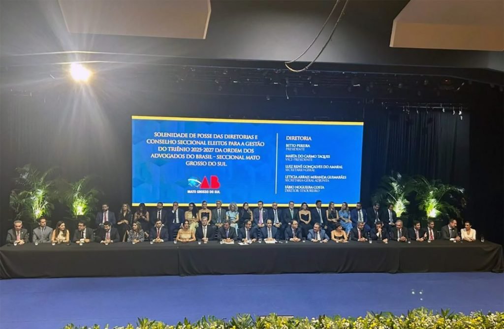 Em cerimônia realizada na noite de terça-feira (28), no Centro de Convenções Rubens Gil de Camillo, a Ordem dos Advogados do Brasil em Mato Grosso do Sul (OAB-MS), empossou sua nova diretoria para o triênio 2024-2026. O evento contou com a presença ilustre do presidente nacional da OAB, José Alberto Simonetti, além do governador Eduardo Riedel (PSDB) e diversas outras autoridades, como representantes da AASP (Associação dos Advogados de São Paulo) e da Fiems (Federação da Indústria de Mato Grosso do Sul).