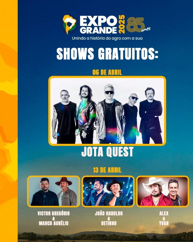 Jota Quest, Mato Grosso & Mathias e artistas regionais são atrações confirmadas com entrada franca em diversos dias da feira.