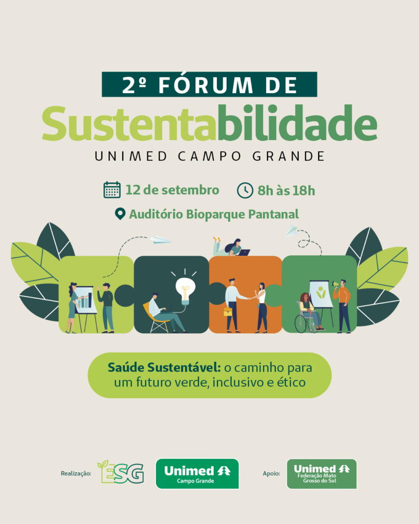 A Unimed Campo Grande realiza, nos dias 11 e 12 de setembro, a 2ª edição do Fórum de Sustentabilidade, com o tema “Saúde Sustentável: O Caminho para um Futuro Verde, Inclusivo e Ético”. O evento, que integra o calendário institucional da cooperativa médica, reafirma o compromisso da instituição com as diretrizes ESG (Ambiental, Social e Governança), promovendo diálogos estratégicos, troca de experiências e disseminação de boas práticas sustentáveis no setor da saúde.