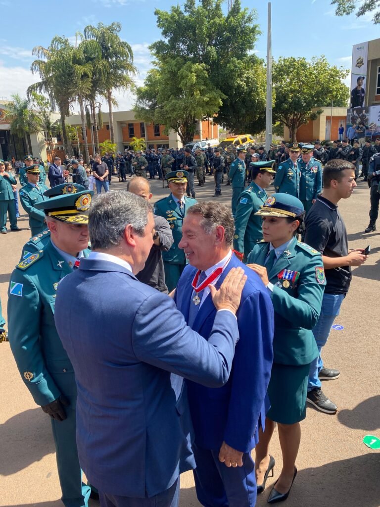 Durante a cerimônia, que contou com a presença do governador Eduardo Riedel e de diversas autoridades da segurança pública, o parlamentar recebeu a Medalha do Mérito e a Insígnia do Mérito Policial Militar, honrarias concedidas a personalidades que contribuem para o fortalecimento da instituição e para a valorização da segurança no Estado.