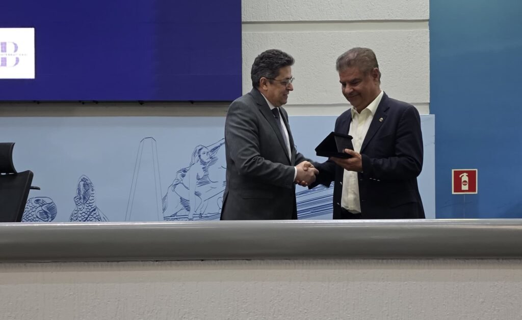 O senador Nelsinho Trad (PSD/MS) foi homenageado, na quinta-feira (30), durante a abertura do Fórum Sul-Americano de Integração da Rota Bioceânica, realizado na Câmara Municipal de Campo Grande. O evento é promovido pelo Conselho Regional de Contabilidade de Mato Grosso do Sul (CRCMS), com apoio da OAB/MS e do Legislativo municipal, e reúne autoridades do Brasil, Paraguai, Argentina e Chile para discutir os avanços e desafios da integração entre os países que compõem o corredor internacional.