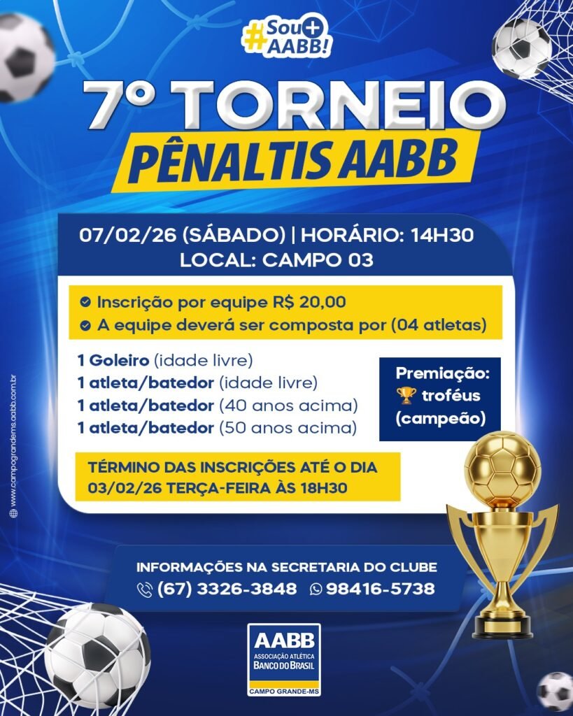 O 7º Torneio de Pênaltis da AABB Campo Grande conta com apoio da diretoria da associação e expectativa de grande público, consolidando mais uma edição de sucesso do evento esportivo.