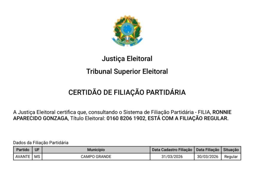 De acordo com certidão emitida pela Tribunal Superior Eleitoral, Ronnie Gonzaga está com filiação regular ao partido Avante desde março de 2026, no município de Campo Grande.