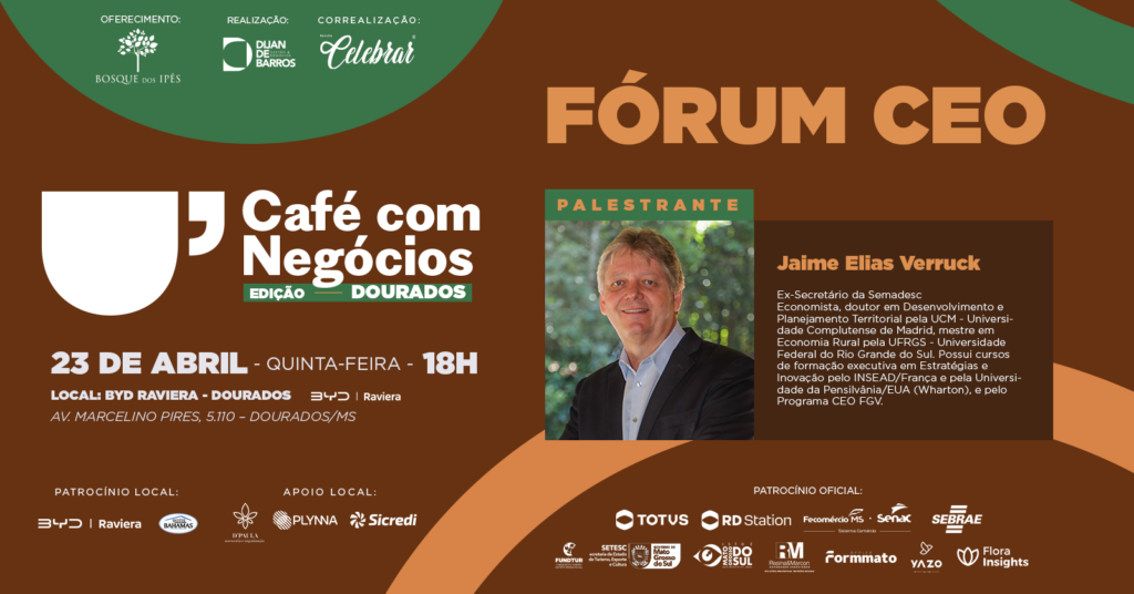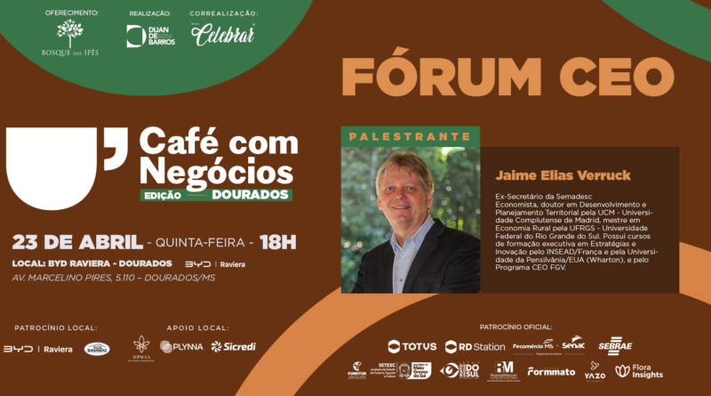 O economista Jaime Elias Verruck será o palestrante do Café com Negócios – Fórum CEO, que acontece nesta terça-feira (23), em Dourados. O evento reunirá empresários, executivos e lideranças para discutir estratégias, investimentos e oportunidades de desenvolvimento em Mato Grosso do Sul.